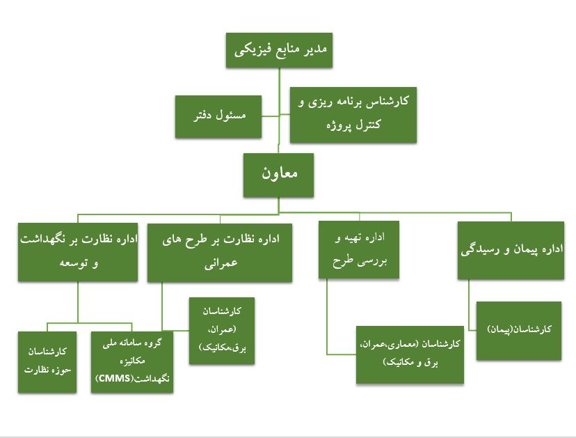 سه اداره تخصصی و دو گروه به طور مستقیم در زیر مجموعه مدیریت منابع فیزیکی و نظارت بر طرح های عمرانی فعالیت دارند.